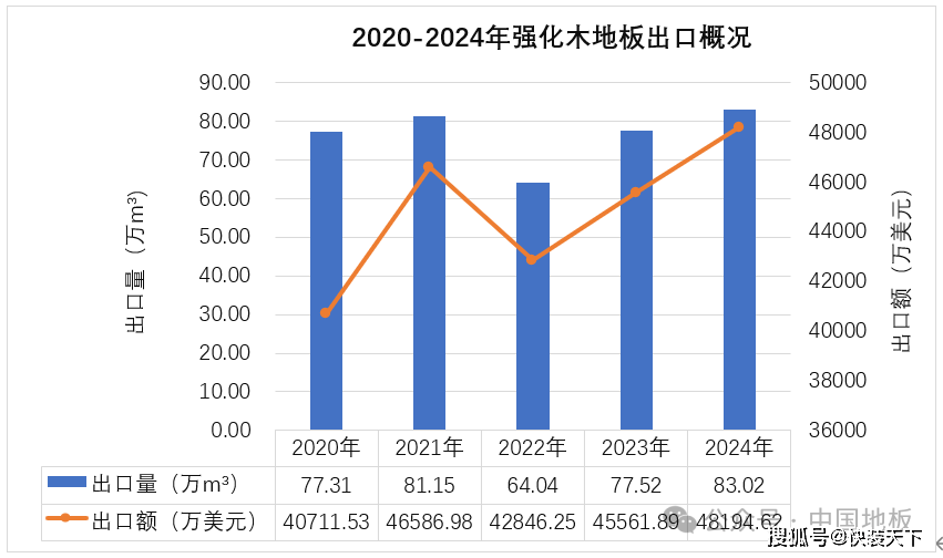 2024年我国强化木地板出口量为83。02万立方米,同比增加7。09%。出口额为4。82亿美元,同比增加5。78%。出口量前五的国度别离是美国(占比24。41%)、(占比14。89%)、(占比9。14%)、越南(占比7。79%)、俄罗斯(占比6。97%),俄罗斯由第三位下降至第五位,同比下降25。31%。