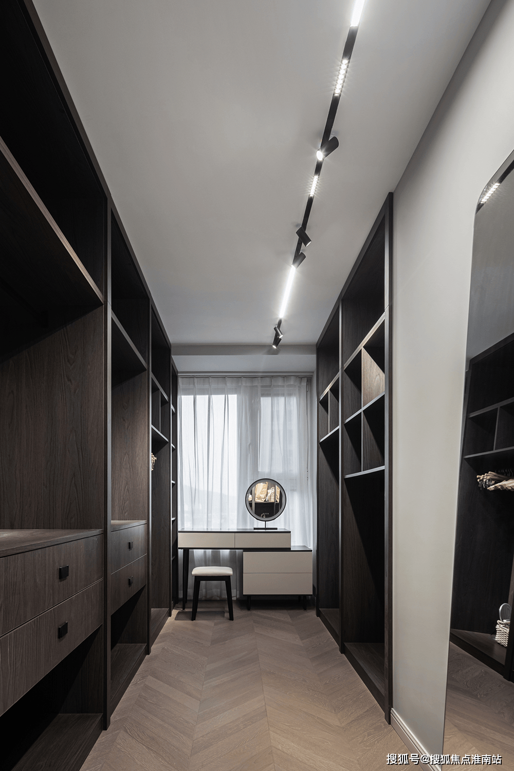 从卧的鱼骨拼木地板取护墙板颜色均选用了深棕色,搭配分歧明度的灰色床品取窗帘,摒弃了浮华的粉饰,整个从卧空间呈现沉稳有条理感的结果。从卫由于空间脚够大所以做了双台盆设想,无效提高糊口效率。灯光细节设想为空间减色不少,搭配灰色系墙地砖,清洁大气好打理。