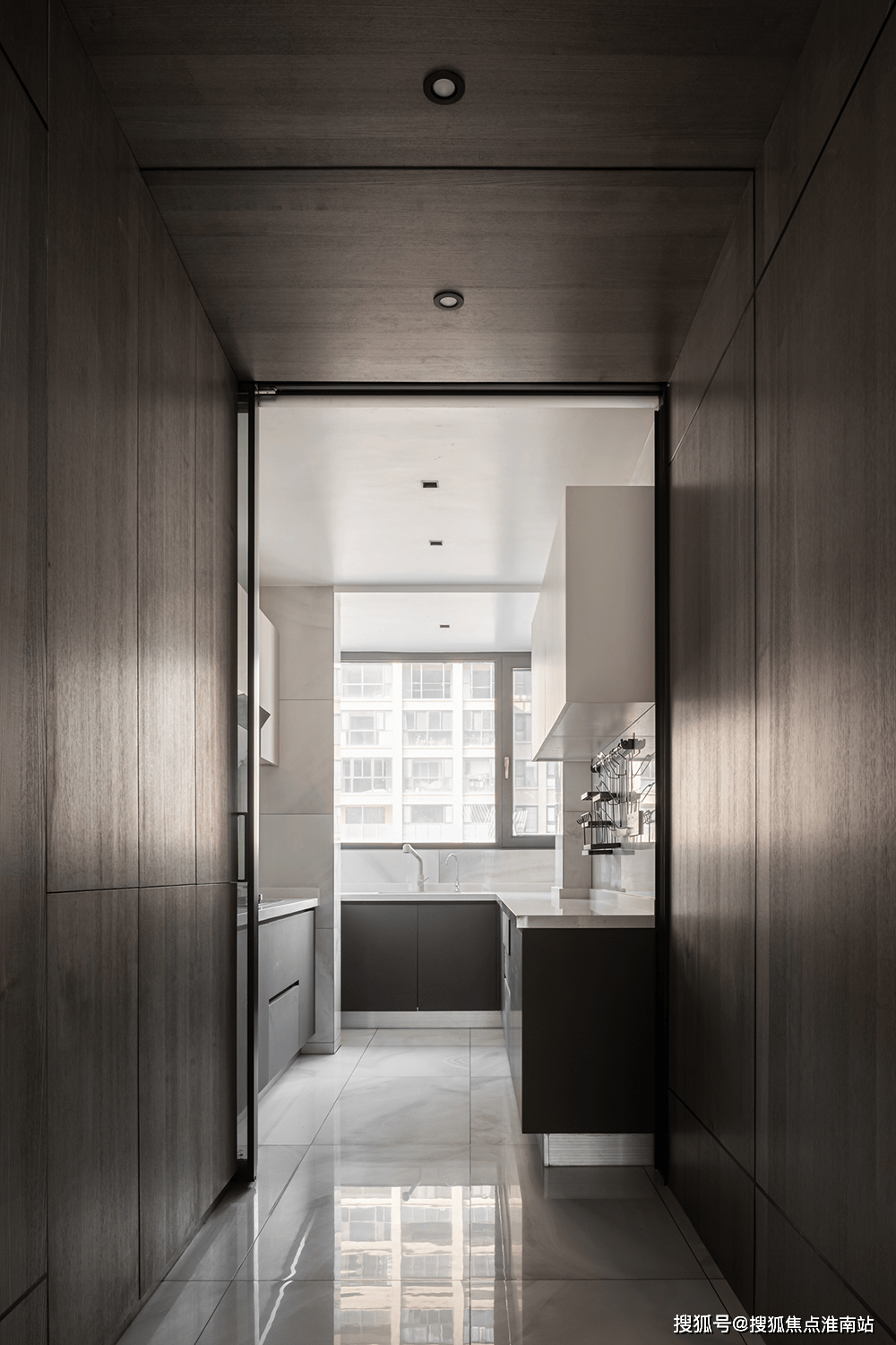 餐厅视角尽头是中厨,操纵了躲藏式推拉门设想了油烟,内部全体色调仍然以口角为从。过道墙壁细心设想为收纳空间,最大限度地操纵了每一块空间加强收纳功能。
