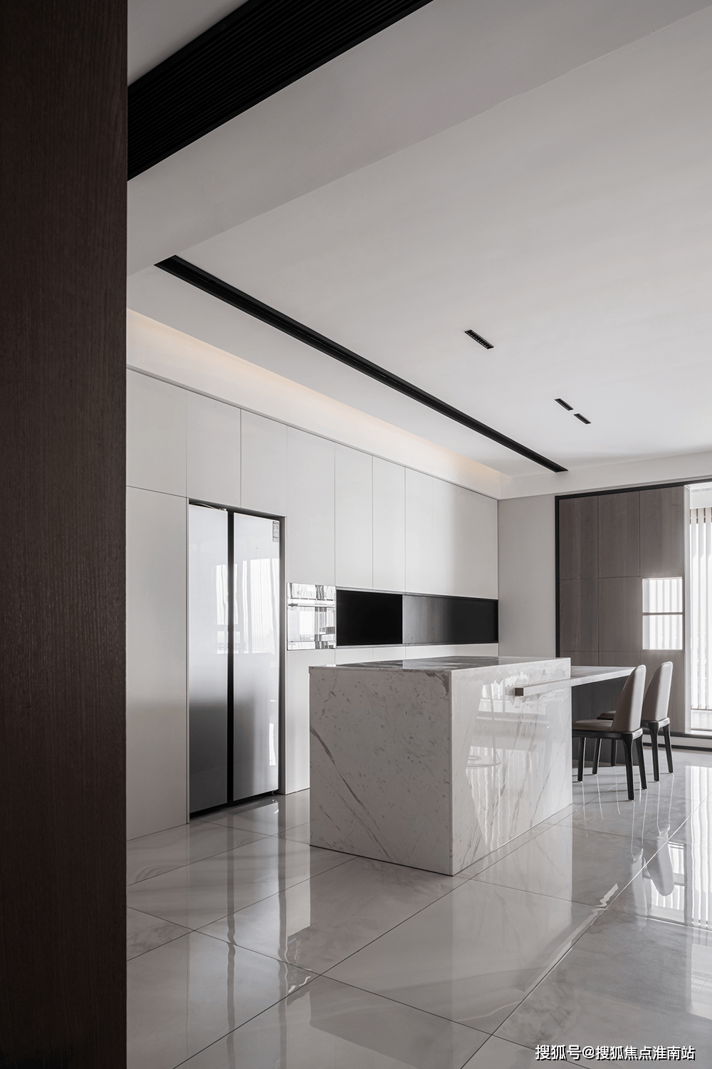 设想师将厨房拆分为厨,西厨使用了岛台和餐桌一体化的设想,白色岩板的岛台、胡桃木餐桌配以皮质餐椅,分歧材质之间的碰撞迸发出更具美感的火花。