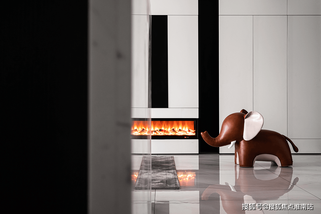 口角配色的电视布景墙将壁炉纳入这块空间,使得本身冷色调的家霎时温暖而治愈。